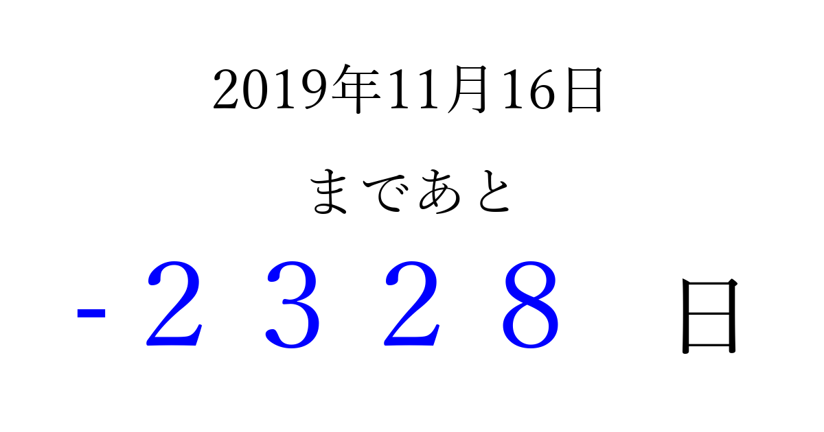 2019年11月16日(土)は もう 0000 日過ぎました 追加すると、トップページからすぐ選べるようになります ※2026/04/01現在の結果です。 最新の状態に更新する ↓シェアして、タイムライン上にカウントダウンを表示しよう!↓ 📤 この結果を共有する Tweet シェア Threads Bluesky 別の日付でカウントダウン 2019年11月のカレンダー このページをブックマークに追加すると、いつでもカウントダウンを確認できます。 (PC: Ctrl+D / Mac: ⌘+D) hitome-notes.comでは以下のページも運営しています。 指定日と期間から日付を計算 | ガチャ確率計算・シミュレーション | プライバシー・ポリシー 運営者:Avocado