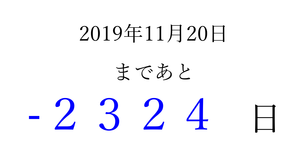 2019年11月20日(水)は もう 0000 日過ぎました 追加すると、トップページからすぐ選べるようになります ※2026/04/01現在の結果です。 最新の状態に更新する ↓シェアして、タイムライン上にカウントダウンを表示しよう!↓ 📤 この結果を共有する Tweet シェア Threads Bluesky 別の日付でカウントダウン 2019年11月のカレンダー このページをブックマークに追加すると、いつでもカウントダウンを確認できます。 (PC: Ctrl+D / Mac: ⌘+D) hitome-notes.comでは以下のページも運営しています。 指定日と期間から日付を計算 | ガチャ確率計算・シミュレーション | プライバシー・ポリシー 運営者:Avocado