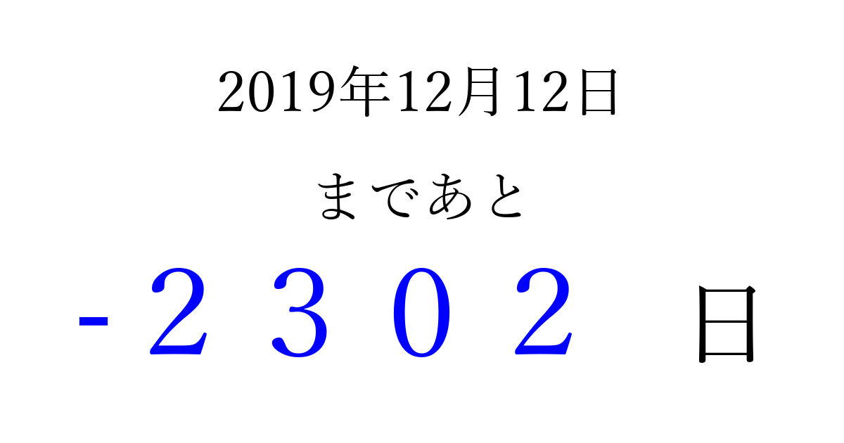 2019年12月12日(木)は もう 0000 日過ぎました 追加すると、トップページからすぐ選べるようになります ※2026/04/01現在の結果です。 最新の状態に更新する ↓シェアして、タイムライン上にカウントダウンを表示しよう!↓ 📤 この結果を共有する Tweet シェア Threads Bluesky 別の日付でカウントダウン 2019年12月のカレンダー このページをブックマークに追加すると、いつでもカウントダウンを確認できます。 (PC: Ctrl+D / Mac: ⌘+D) hitome-notes.comでは以下のページも運営しています。 指定日と期間から日付を計算 | ガチャ確率計算・シミュレーション | プライバシー・ポリシー 運営者:Avocado