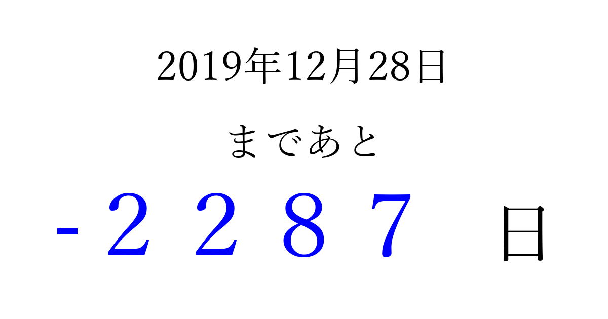 2019年12月28日(土)は もう 0000 日過ぎました 追加すると、トップページからすぐ選べるようになります ※2026/04/02現在の結果です。 最新の状態に更新する ↓シェアして、タイムライン上にカウントダウンを表示しよう!↓ 📤 この結果を共有する Tweet シェア Threads Bluesky 別の日付でカウントダウン 2019年12月のカレンダー このページをブックマークに追加すると、いつでもカウントダウンを確認できます。 (PC: Ctrl+D / Mac: ⌘+D) hitome-notes.comでは以下のページも運営しています。 指定日と期間から日付を計算 | ガチャ確率計算・シミュレーション | プライバシー・ポリシー 運営者:Avocado