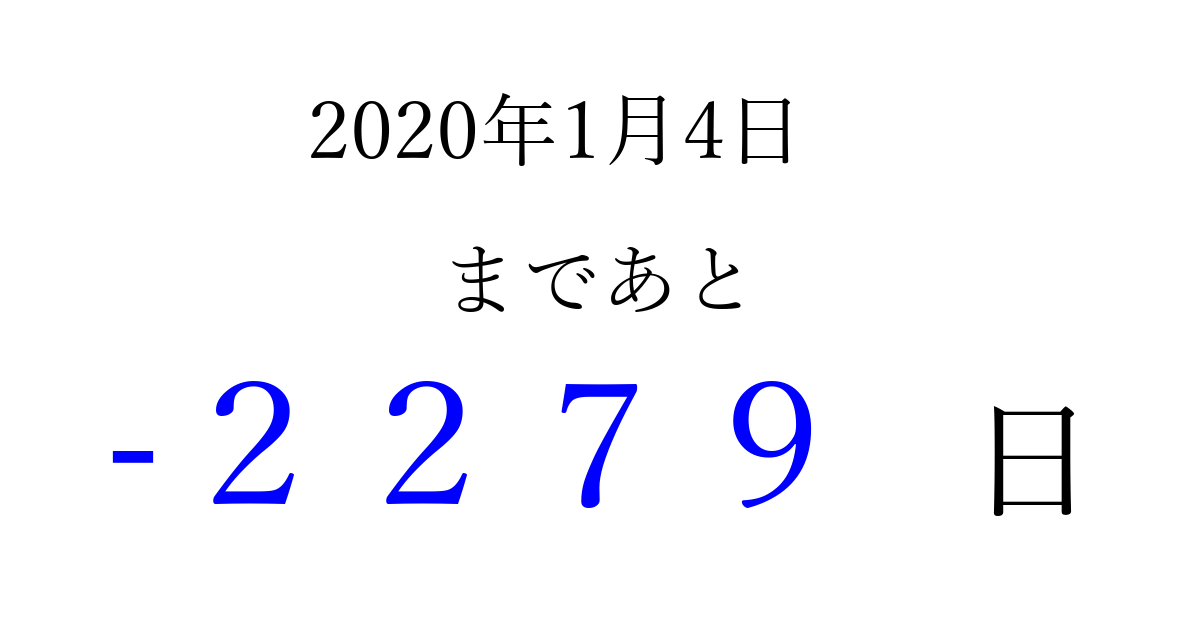 2020年1月4日(土)は もう 0000 日過ぎました 追加すると、トップページからすぐ選べるようになります ※2026/04/01現在の結果です。 最新の状態に更新する ↓シェアして、タイムライン上にカウントダウンを表示しよう!↓ 📤 この結果を共有する Tweet シェア Threads Bluesky 別の日付でカウントダウン 2020年1月のカレンダー このページをブックマークに追加すると、いつでもカウントダウンを確認できます。 (PC: Ctrl+D / Mac: ⌘+D) hitome-notes.comでは以下のページも運営しています。 指定日と期間から日付を計算 | ガチャ確率計算・シミュレーション | プライバシー・ポリシー 運営者:Avocado