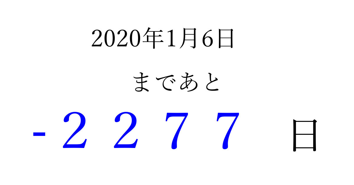 2020年1月6日(月)は もう 0000 日過ぎました 追加すると、トップページからすぐ選べるようになります ※2026/04/01現在の結果です。 最新の状態に更新する ↓シェアして、タイムライン上にカウントダウンを表示しよう!↓ 📤 この結果を共有する Tweet シェア Threads Bluesky 別の日付でカウントダウン 2020年1月のカレンダー このページをブックマークに追加すると、いつでもカウントダウンを確認できます。 (PC: Ctrl+D / Mac: ⌘+D) hitome-notes.comでは以下のページも運営しています。 指定日と期間から日付を計算 | ガチャ確率計算・シミュレーション | プライバシー・ポリシー 運営者:Avocado