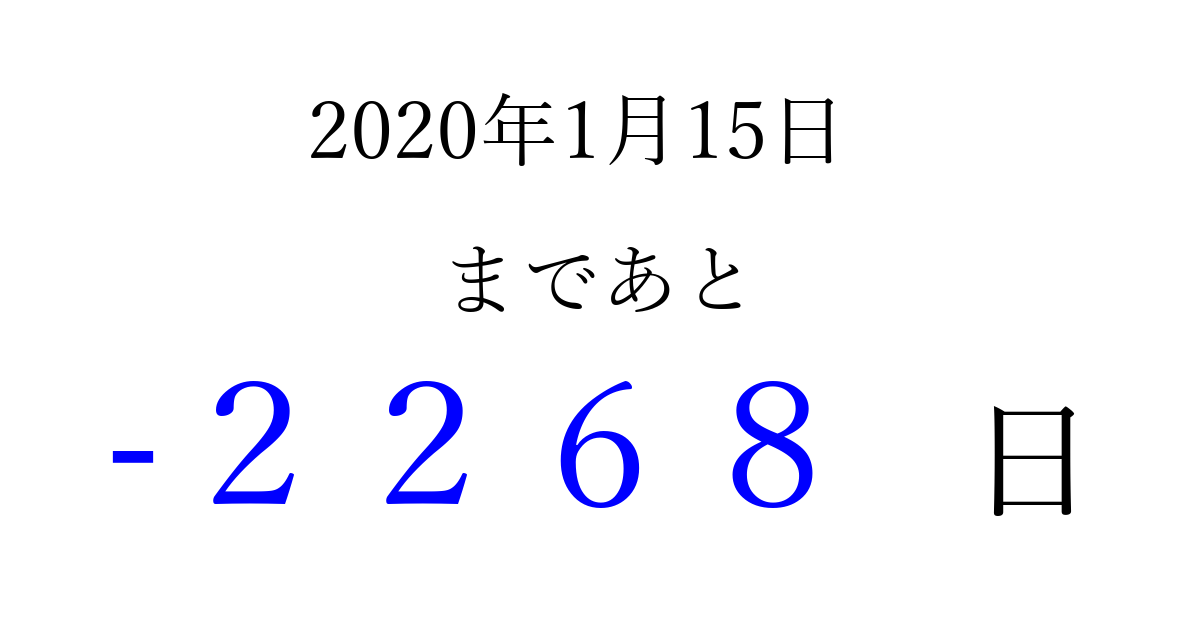 2020年1月15日(水)は もう 0000 日過ぎました 追加すると、トップページからすぐ選べるようになります ※2026/04/01現在の結果です。 最新の状態に更新する ↓シェアして、タイムライン上にカウントダウンを表示しよう!↓ 📤 この結果を共有する Tweet シェア Threads Bluesky 別の日付でカウントダウン 2020年1月のカレンダー このページをブックマークに追加すると、いつでもカウントダウンを確認できます。 (PC: Ctrl+D / Mac: ⌘+D) hitome-notes.comでは以下のページも運営しています。 指定日と期間から日付を計算 | ガチャ確率計算・シミュレーション | プライバシー・ポリシー 運営者:Avocado