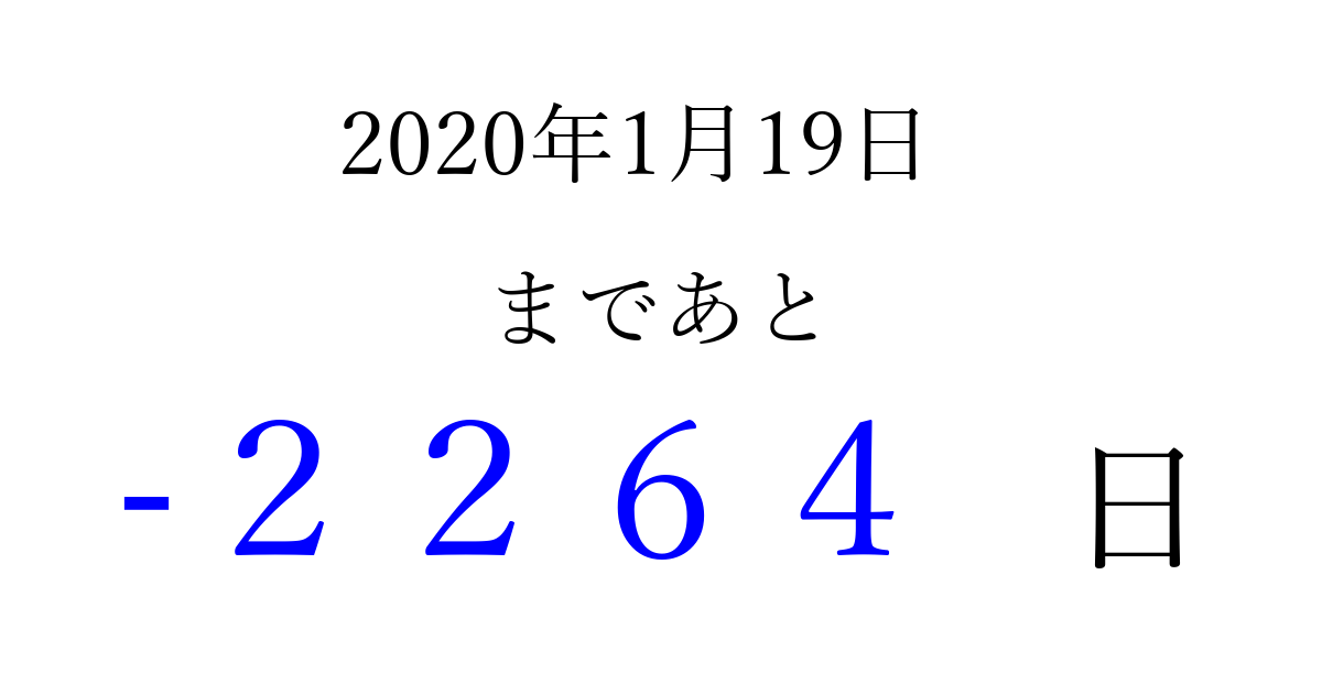 2020年1月19日(日)は もう 0000 日過ぎました 追加すると、トップページからすぐ選べるようになります ※2026/04/01現在の結果です。 最新の状態に更新する ↓シェアして、タイムライン上にカウントダウンを表示しよう!↓ 📤 この結果を共有する Tweet シェア Threads Bluesky 別の日付でカウントダウン 2020年1月のカレンダー このページをブックマークに追加すると、いつでもカウントダウンを確認できます。 (PC: Ctrl+D / Mac: ⌘+D) hitome-notes.comでは以下のページも運営しています。 指定日と期間から日付を計算 | ガチャ確率計算・シミュレーション | プライバシー・ポリシー 運営者:Avocado