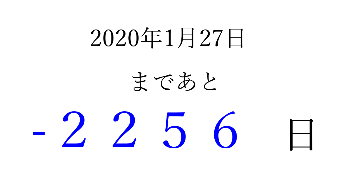 2020年1月27日(月)は もう 0000 日過ぎました 追加すると、トップページからすぐ選べるようになります ※2026/04/01現在の結果です。 最新の状態に更新する ↓シェアして、タイムライン上にカウントダウンを表示しよう!↓ 📤 この結果を共有する Tweet シェア Threads Bluesky 別の日付でカウントダウン 2020年1月のカレンダー このページをブックマークに追加すると、いつでもカウントダウンを確認できます。 (PC: Ctrl+D / Mac: ⌘+D) hitome-notes.comでは以下のページも運営しています。 指定日と期間から日付を計算 | ガチャ確率計算・シミュレーション | プライバシー・ポリシー 運営者:Avocado