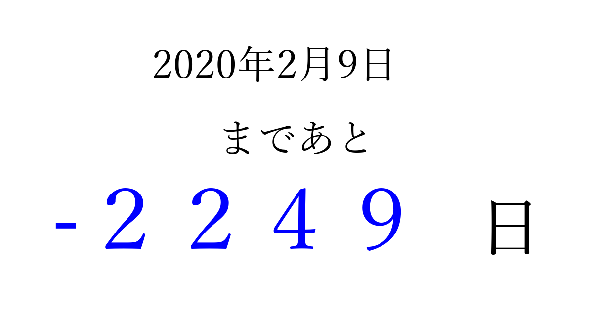 2020年2月9日(日)は もう 0000 日過ぎました 追加すると、トップページからすぐ選べるようになります ※2026/04/07現在の結果です。 最新の状態に更新する ↓シェアして、タイムライン上にカウントダウンを表示しよう!↓ 📤 この結果を共有する Tweet シェア Threads Bluesky 別の日付でカウントダウン 2020年2月のカレンダー このページをブックマークに追加すると、いつでもカウントダウンを確認できます。 (PC: Ctrl+D / Mac: ⌘+D) hitome-notes.comでは以下のページも運営しています。 指定日と期間から日付を計算 | ガチャ確率計算・シミュレーション | プライバシー・ポリシー 運営者:Avocado