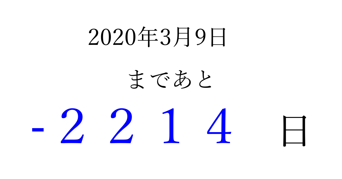 2020年3月9日(月)は もう 0000 日過ぎました 追加すると、トップページからすぐ選べるようになります ※2026/04/01現在の結果です。 最新の状態に更新する ↓シェアして、タイムライン上にカウントダウンを表示しよう!↓ 📤 この結果を共有する Tweet シェア Threads Bluesky 別の日付でカウントダウン 2020年3月のカレンダー このページをブックマークに追加すると、いつでもカウントダウンを確認できます。 (PC: Ctrl+D / Mac: ⌘+D) hitome-notes.comでは以下のページも運営しています。 指定日と期間から日付を計算 | ガチャ確率計算・シミュレーション | プライバシー・ポリシー 運営者:Avocado