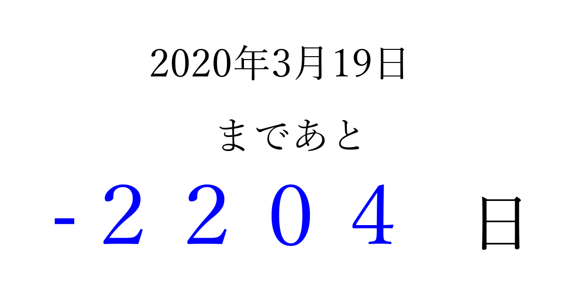 2020年3月19日(木)は もう 0000 日過ぎました 追加すると、トップページからすぐ選べるようになります ※2026/04/01現在の結果です。 最新の状態に更新する ↓シェアして、タイムライン上にカウントダウンを表示しよう!↓ 📤 この結果を共有する Tweet シェア Threads Bluesky 別の日付でカウントダウン 2020年3月のカレンダー このページをブックマークに追加すると、いつでもカウントダウンを確認できます。 (PC: Ctrl+D / Mac: ⌘+D) hitome-notes.comでは以下のページも運営しています。 指定日と期間から日付を計算 | ガチャ確率計算・シミュレーション | プライバシー・ポリシー 運営者:Avocado