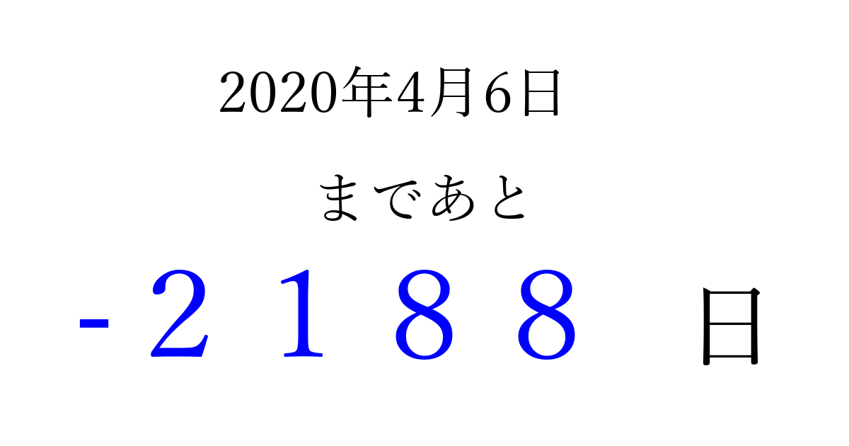 2020年4月6日(月)は もう 0000 日過ぎました 追加すると、トップページからすぐ選べるようになります ※2026/04/03現在の結果です。 最新の状態に更新する ↓シェアして、タイムライン上にカウントダウンを表示しよう!↓ 📤 この結果を共有する Tweet シェア Threads Bluesky 別の日付でカウントダウン 2020年4月のカレンダー このページをブックマークに追加すると、いつでもカウントダウンを確認できます。 (PC: Ctrl+D / Mac: ⌘+D) hitome-notes.comでは以下のページも運営しています。 指定日と期間から日付を計算 | ガチャ確率計算・シミュレーション | プライバシー・ポリシー 運営者:Avocado