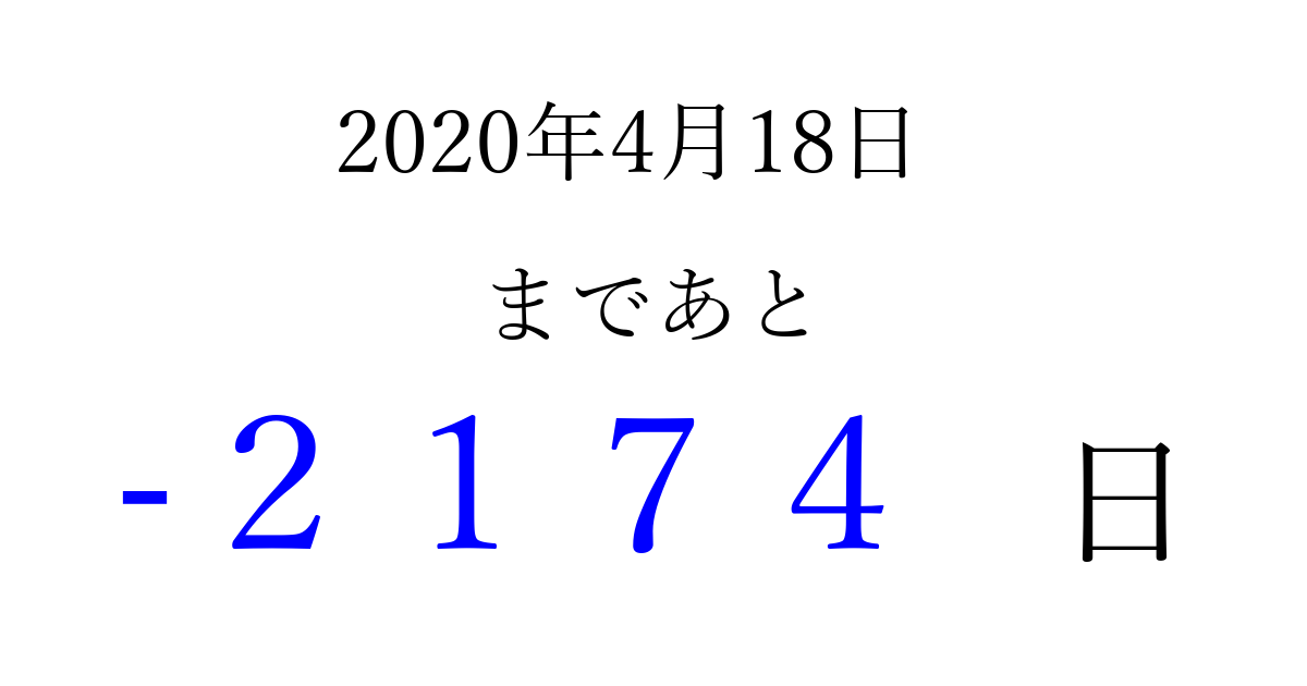 2020年4月18日(土)は もう 0000 日過ぎました 追加すると、トップページからすぐ選べるようになります ※2026/04/01現在の結果です。 最新の状態に更新する ↓シェアして、タイムライン上にカウントダウンを表示しよう!↓ 📤 この結果を共有する Tweet シェア Threads Bluesky 別の日付でカウントダウン 2020年4月のカレンダー このページをブックマークに追加すると、いつでもカウントダウンを確認できます。 (PC: Ctrl+D / Mac: ⌘+D) hitome-notes.comでは以下のページも運営しています。 指定日と期間から日付を計算 | ガチャ確率計算・シミュレーション | プライバシー・ポリシー 運営者:Avocado