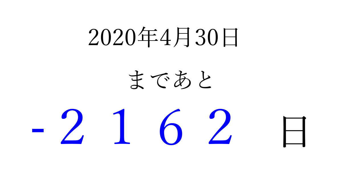 2020年4月30日(木)は もう 0000 日過ぎました 追加すると、トップページからすぐ選べるようになります ※2026/04/01現在の結果です。 最新の状態に更新する ↓シェアして、タイムライン上にカウントダウンを表示しよう!↓ 📤 この結果を共有する Tweet シェア Threads Bluesky 別の日付でカウントダウン 2020年4月のカレンダー このページをブックマークに追加すると、いつでもカウントダウンを確認できます。 (PC: Ctrl+D / Mac: ⌘+D) hitome-notes.comでは以下のページも運営しています。 指定日と期間から日付を計算 | ガチャ確率計算・シミュレーション | プライバシー・ポリシー 運営者:Avocado