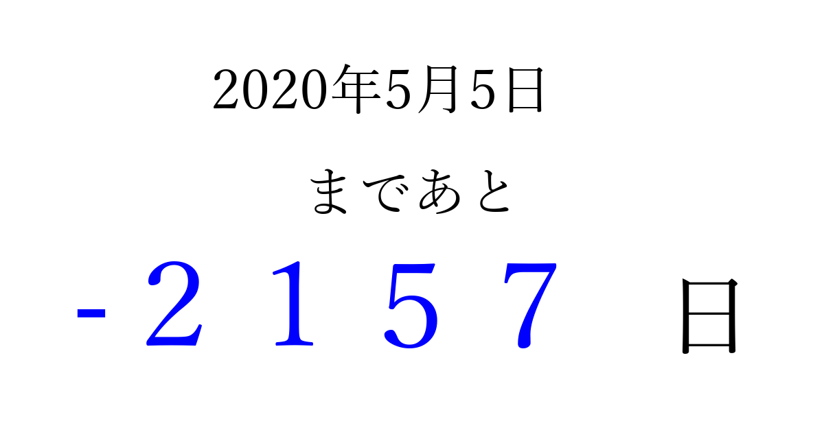 2020年5月5日(火)は もう 0000 日過ぎました 追加すると、トップページからすぐ選べるようになります ※2026/04/01現在の結果です。 最新の状態に更新する ↓シェアして、タイムライン上にカウントダウンを表示しよう!↓ 📤 この結果を共有する Tweet シェア Threads Bluesky この日は何の日?こどもの日 別の日付でカウントダウン 2020年5月のカレンダー このページをブックマークに追加すると、いつでもカウントダウンを確認できます。 (PC: Ctrl+D / Mac: ⌘+D) hitome-notes.comでは以下のページも運営しています。 指定日と期間から日付を計算 | ガチャ確率計算・シミュレーション | プライバシー・ポリシー 運営者:Avocado