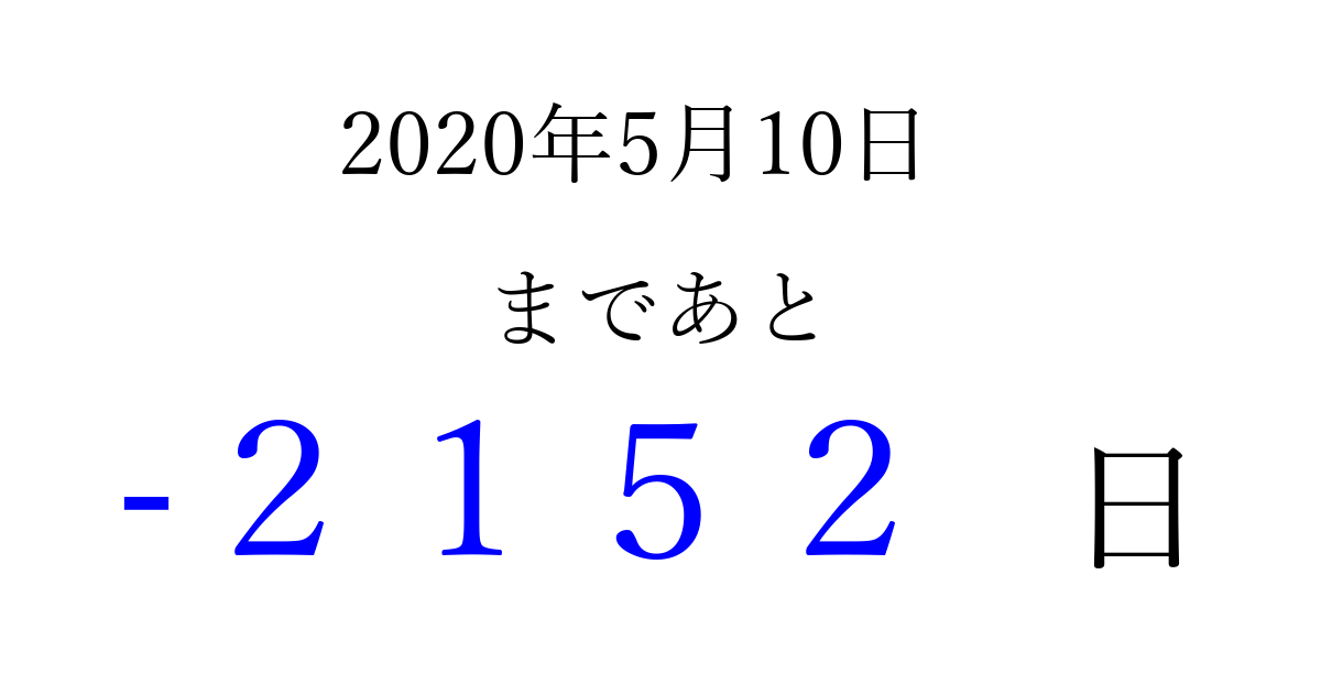 2020年5月10日(日)は もう 0000 日過ぎました 追加すると、トップページからすぐ選べるようになります ※2026/04/01現在の結果です。 最新の状態に更新する ↓シェアして、タイムライン上にカウントダウンを表示しよう!↓ 📤 この結果を共有する Tweet シェア Threads Bluesky 別の日付でカウントダウン 2020年5月のカレンダー このページをブックマークに追加すると、いつでもカウントダウンを確認できます。 (PC: Ctrl+D / Mac: ⌘+D) hitome-notes.comでは以下のページも運営しています。 指定日と期間から日付を計算 | ガチャ確率計算・シミュレーション | プライバシー・ポリシー 運営者:Avocado