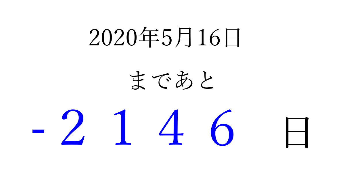 2020年5月16日(土)は もう 0000 日過ぎました 追加すると、トップページからすぐ選べるようになります ※2026/04/01現在の結果です。 最新の状態に更新する ↓シェアして、タイムライン上にカウントダウンを表示しよう!↓ 📤 この結果を共有する Tweet シェア Threads Bluesky 別の日付でカウントダウン 2020年5月のカレンダー このページをブックマークに追加すると、いつでもカウントダウンを確認できます。 (PC: Ctrl+D / Mac: ⌘+D) hitome-notes.comでは以下のページも運営しています。 指定日と期間から日付を計算 | ガチャ確率計算・シミュレーション | プライバシー・ポリシー 運営者:Avocado