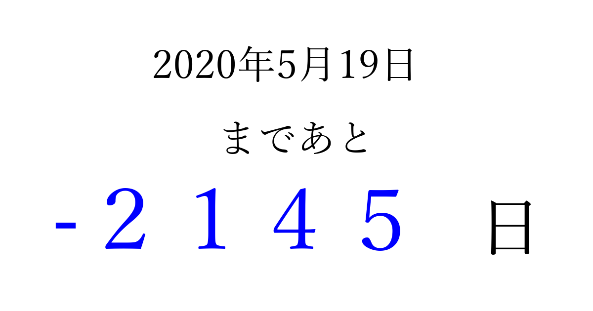 2020年5月19日(火)は もう 0000 日過ぎました 追加すると、トップページからすぐ選べるようになります ※2026/04/03現在の結果です。 最新の状態に更新する ↓シェアして、タイムライン上にカウントダウンを表示しよう!↓ 📤 この結果を共有する Tweet シェア Threads Bluesky 別の日付でカウントダウン 2020年5月のカレンダー このページをブックマークに追加すると、いつでもカウントダウンを確認できます。 (PC: Ctrl+D / Mac: ⌘+D) hitome-notes.comでは以下のページも運営しています。 指定日と期間から日付を計算 | ガチャ確率計算・シミュレーション | プライバシー・ポリシー 運営者:Avocado
