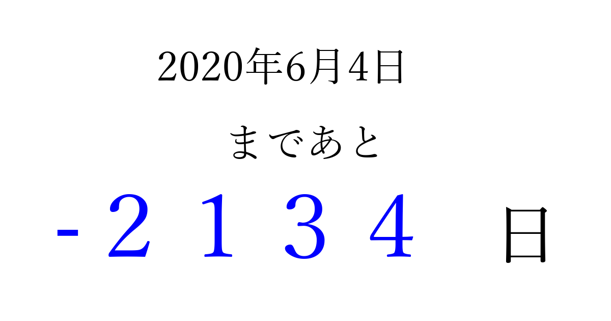 2020年6月4日(木)は もう 0000 日過ぎました 追加すると、トップページからすぐ選べるようになります ※2026/04/08現在の結果です。 最新の状態に更新する ↓シェアして、タイムライン上にカウントダウンを表示しよう!↓ 📤 この結果を共有する Tweet シェア Threads Bluesky 別の日付でカウントダウン 2020年6月のカレンダー このページをブックマークに追加すると、いつでもカウントダウンを確認できます。 (PC: Ctrl+D / Mac: ⌘+D) hitome-notes.comでは以下のページも運営しています。 指定日と期間から日付を計算 | ガチャ確率計算・シミュレーション | プライバシー・ポリシー 運営者:Avocado
