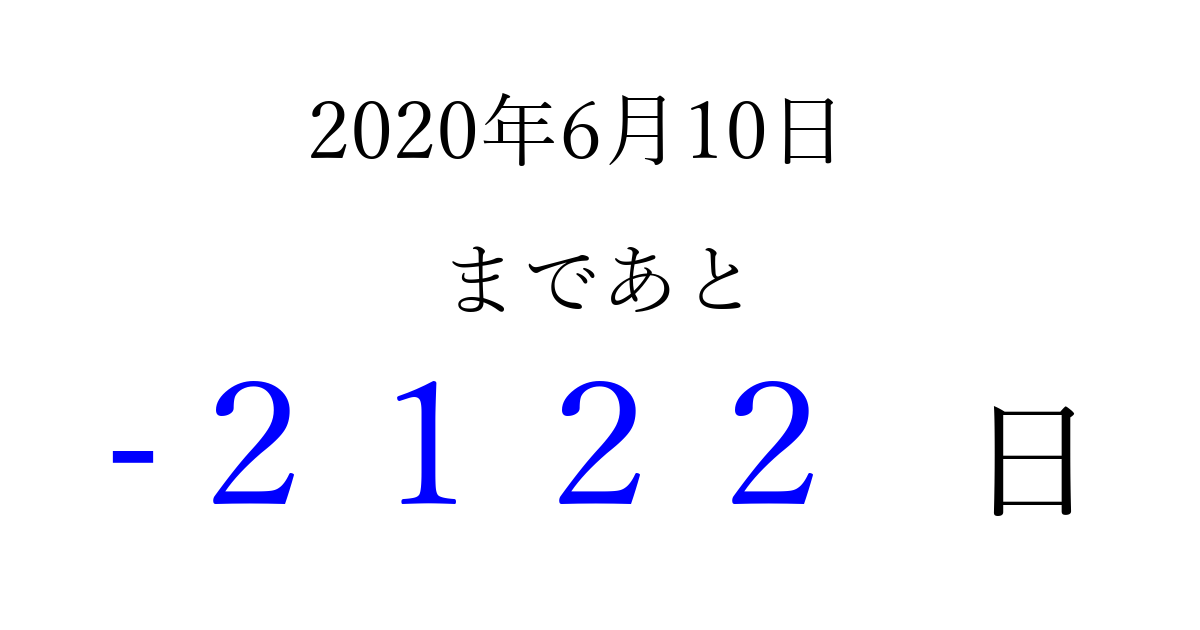 2020年6月10日(水)は もう 0000 日過ぎました 追加すると、トップページからすぐ選べるようになります ※2026/04/02現在の結果です。 最新の状態に更新する ↓シェアして、タイムライン上にカウントダウンを表示しよう!↓ 📤 この結果を共有する Tweet シェア Threads Bluesky 別の日付でカウントダウン 2020年6月のカレンダー このページをブックマークに追加すると、いつでもカウントダウンを確認できます。 (PC: Ctrl+D / Mac: ⌘+D) hitome-notes.comでは以下のページも運営しています。 指定日と期間から日付を計算 | ガチャ確率計算・シミュレーション | プライバシー・ポリシー 運営者:Avocado