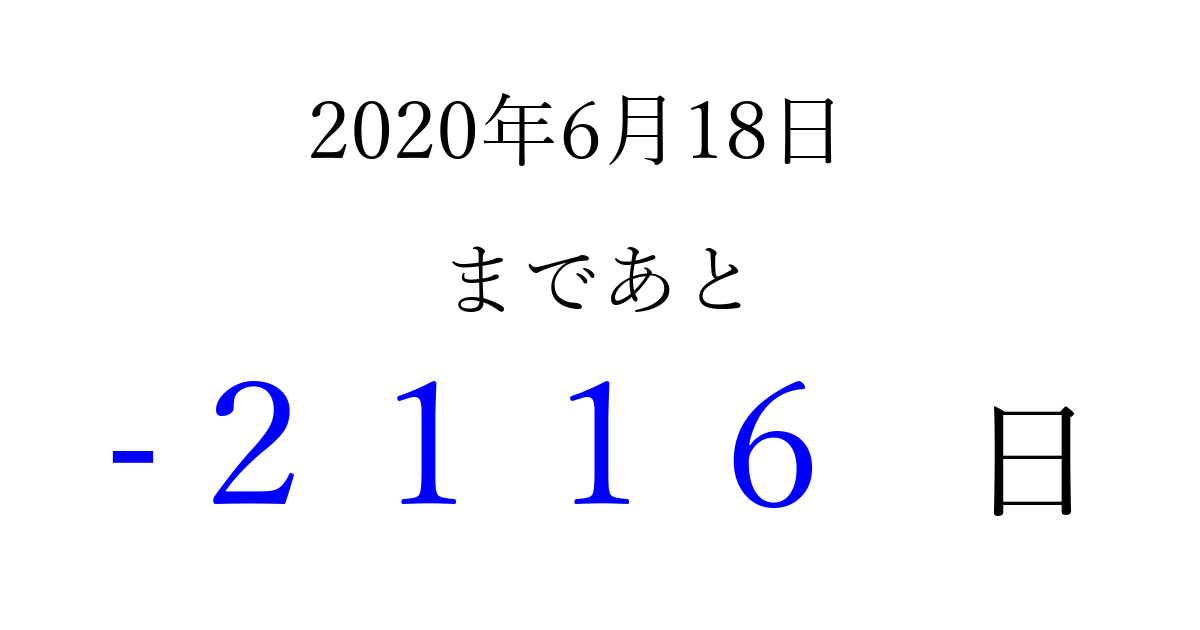 2020年6月18日(木)は もう 0000 日過ぎました 追加すると、トップページからすぐ選べるようになります ※2026/04/04現在の結果です。 最新の状態に更新する ↓シェアして、タイムライン上にカウントダウンを表示しよう!↓ 📤 この結果を共有する Tweet シェア Threads Bluesky 別の日付でカウントダウン 2020年6月のカレンダー このページをブックマークに追加すると、いつでもカウントダウンを確認できます。 (PC: Ctrl+D / Mac: ⌘+D) hitome-notes.comでは以下のページも運営しています。 指定日と期間から日付を計算 | ガチャ確率計算・シミュレーション | プライバシー・ポリシー 運営者:Avocado
