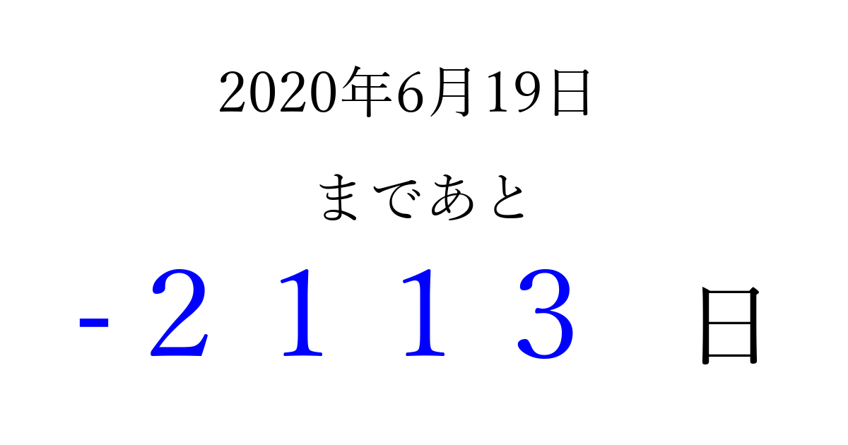 2020年6月19日(金)は もう 0000 日過ぎました 追加すると、トップページからすぐ選べるようになります ※2026/04/02現在の結果です。 最新の状態に更新する ↓シェアして、タイムライン上にカウントダウンを表示しよう!↓ 📤 この結果を共有する Tweet シェア Threads Bluesky 別の日付でカウントダウン 2020年6月のカレンダー このページをブックマークに追加すると、いつでもカウントダウンを確認できます。 (PC: Ctrl+D / Mac: ⌘+D) hitome-notes.comでは以下のページも運営しています。 指定日と期間から日付を計算 | ガチャ確率計算・シミュレーション | プライバシー・ポリシー 運営者:Avocado