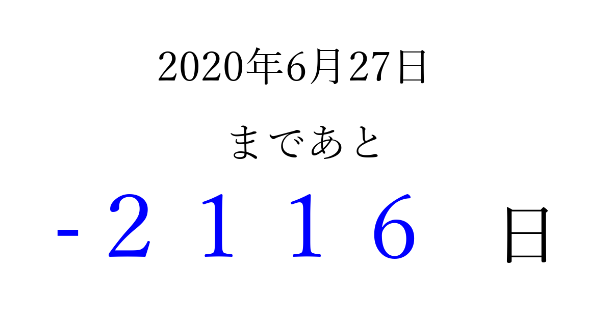 2020年6月27日(土)は もう 0000 日過ぎました 追加すると、トップページからすぐ選べるようになります ※2026/04/13現在の結果です。 最新の状態に更新する ↓シェアして、タイムライン上にカウントダウンを表示しよう!↓ 📤 この結果を共有する Tweet シェア Threads Bluesky 別の日付でカウントダウン 2020年6月のカレンダー このページをブックマークに追加すると、いつでもカウントダウンを確認できます。 (PC: Ctrl+D / Mac: ⌘+D) hitome-notes.comでは以下のページも運営しています。 指定日と期間から日付を計算 | ガチャ確率計算・シミュレーション | プライバシー・ポリシー 運営者:Avocado