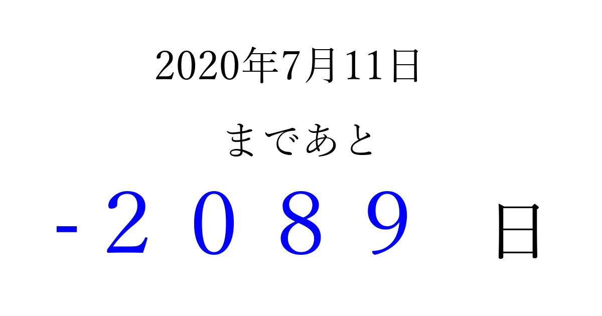 2020年7月11日(土)は もう 0000 日過ぎました 追加すると、トップページからすぐ選べるようになります ※2026/03/31現在の結果です。 最新の状態に更新する ↓シェアして、タイムライン上にカウントダウンを表示しよう!↓ 📤 この結果を共有する Tweet シェア Threads Bluesky 別の日付でカウントダウン 2020年7月のカレンダー このページをブックマークに追加すると、いつでもカウントダウンを確認できます。 (PC: Ctrl+D / Mac: ⌘+D) hitome-notes.comでは以下のページも運営しています。 指定日と期間から日付を計算 | ガチャ確率計算・シミュレーション | プライバシー・ポリシー 運営者:Avocado