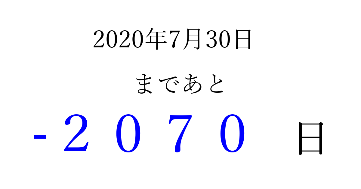 2020年7月30日(木)は もう 0000 日過ぎました 追加すると、トップページからすぐ選べるようになります ※2026/03/31現在の結果です。 最新の状態に更新する ↓シェアして、タイムライン上にカウントダウンを表示しよう!↓ 📤 この結果を共有する Tweet シェア Threads Bluesky 別の日付でカウントダウン 2020年7月のカレンダー このページをブックマークに追加すると、いつでもカウントダウンを確認できます。 (PC: Ctrl+D / Mac: ⌘+D) hitome-notes.comでは以下のページも運営しています。 指定日と期間から日付を計算 | ガチャ確率計算・シミュレーション | プライバシー・ポリシー 運営者:Avocado