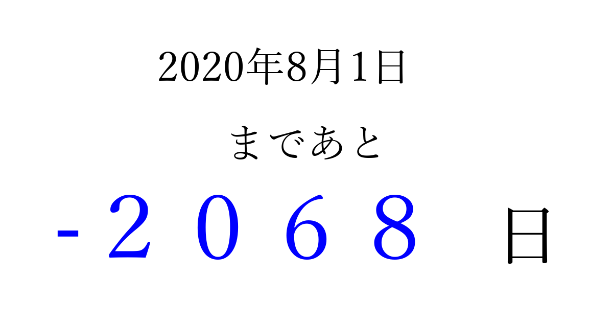 2020年8月1日(土)は もう 0000 日過ぎました 追加すると、トップページからすぐ選べるようになります ※2026/03/31現在の結果です。 最新の状態に更新する ↓シェアして、タイムライン上にカウントダウンを表示しよう!↓ 📤 この結果を共有する Tweet シェア Threads Bluesky 別の日付でカウントダウン 2020年8月のカレンダー このページをブックマークに追加すると、いつでもカウントダウンを確認できます。 (PC: Ctrl+D / Mac: ⌘+D) hitome-notes.comでは以下のページも運営しています。 指定日と期間から日付を計算 | ガチャ確率計算・シミュレーション | プライバシー・ポリシー 運営者:Avocado