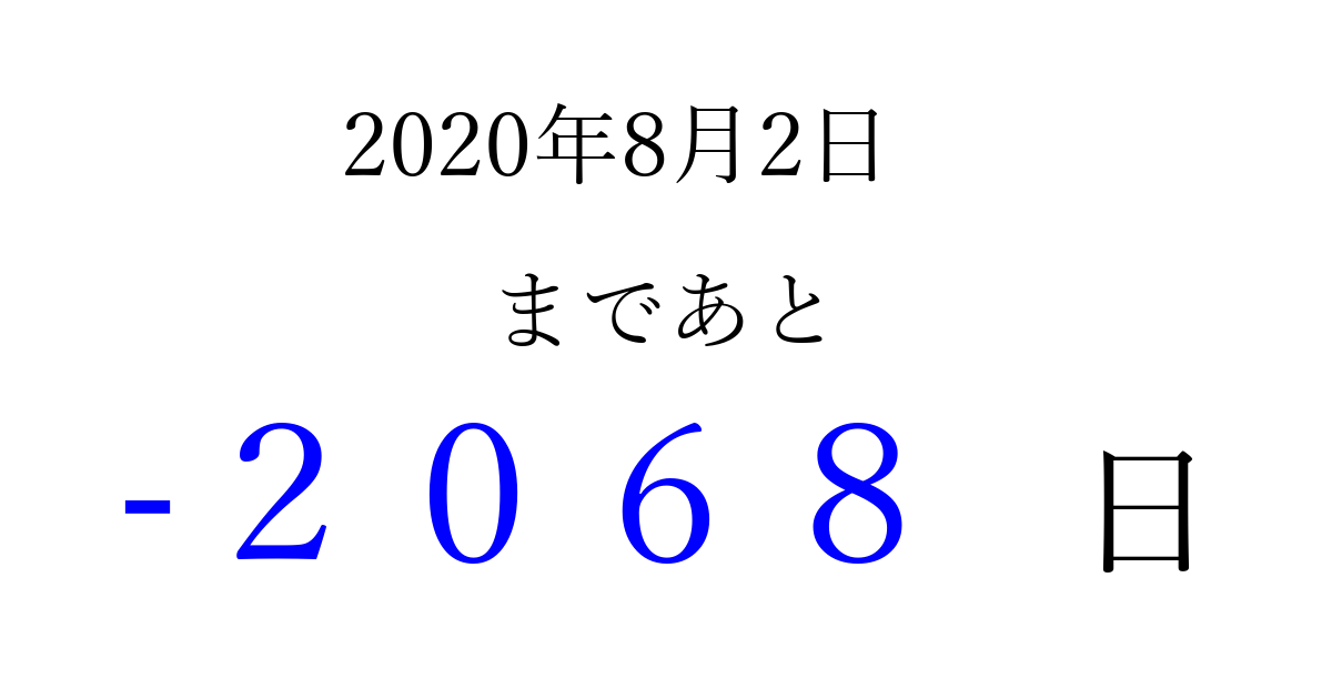2020年8月2日(日)は もう 0000 日過ぎました 追加すると、トップページからすぐ選べるようになります ※2026/04/01現在の結果です。 最新の状態に更新する ↓シェアして、タイムライン上にカウントダウンを表示しよう!↓ 📤 この結果を共有する Tweet シェア Threads Bluesky 別の日付でカウントダウン 2020年8月のカレンダー このページをブックマークに追加すると、いつでもカウントダウンを確認できます。 (PC: Ctrl+D / Mac: ⌘+D) hitome-notes.comでは以下のページも運営しています。 指定日と期間から日付を計算 | ガチャ確率計算・シミュレーション | プライバシー・ポリシー 運営者:Avocado