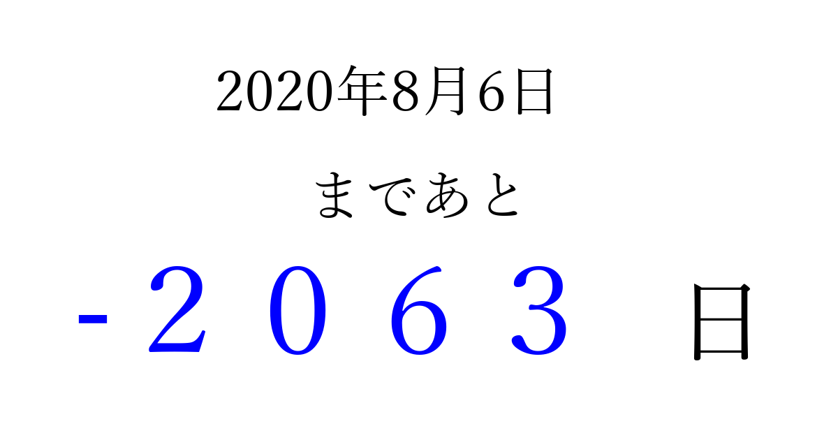 2020年8月6日(木)は もう 0000 日過ぎました 追加すると、トップページからすぐ選べるようになります ※2026/03/31現在の結果です。 最新の状態に更新する ↓シェアして、タイムライン上にカウントダウンを表示しよう!↓ 📤 この結果を共有する Tweet シェア Threads Bluesky 別の日付でカウントダウン 2020年8月のカレンダー このページをブックマークに追加すると、いつでもカウントダウンを確認できます。 (PC: Ctrl+D / Mac: ⌘+D) hitome-notes.comでは以下のページも運営しています。 指定日と期間から日付を計算 | ガチャ確率計算・シミュレーション | プライバシー・ポリシー 運営者:Avocado