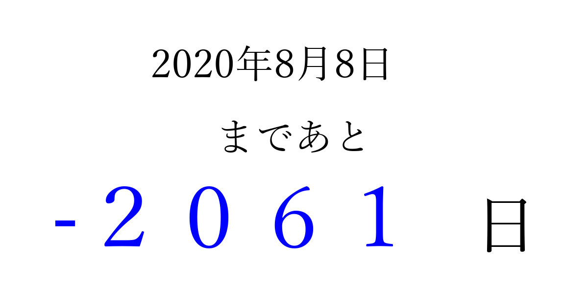 2020年8月8日(土)は もう 0000 日過ぎました 追加すると、トップページからすぐ選べるようになります ※2026/03/31現在の結果です。 最新の状態に更新する ↓シェアして、タイムライン上にカウントダウンを表示しよう!↓ 📤 この結果を共有する Tweet シェア Threads Bluesky 別の日付でカウントダウン 2020年8月のカレンダー このページをブックマークに追加すると、いつでもカウントダウンを確認できます。 (PC: Ctrl+D / Mac: ⌘+D) hitome-notes.comでは以下のページも運営しています。 指定日と期間から日付を計算 | ガチャ確率計算・シミュレーション | プライバシー・ポリシー 運営者:Avocado