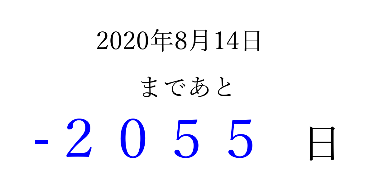 2020年8月14日(金)は もう 0000 日過ぎました 追加すると、トップページからすぐ選べるようになります ※2026/03/31現在の結果です。 最新の状態に更新する ↓シェアして、タイムライン上にカウントダウンを表示しよう!↓ 📤 この結果を共有する Tweet シェア Threads Bluesky 別の日付でカウントダウン 2020年8月のカレンダー このページをブックマークに追加すると、いつでもカウントダウンを確認できます。 (PC: Ctrl+D / Mac: ⌘+D) hitome-notes.comでは以下のページも運営しています。 指定日と期間から日付を計算 | ガチャ確率計算・シミュレーション | プライバシー・ポリシー 運営者:Avocado