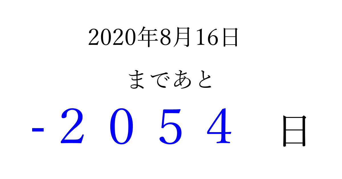 2020年8月16日(日)は もう 0000 日過ぎました 追加すると、トップページからすぐ選べるようになります ※2026/04/01現在の結果です。 最新の状態に更新する ↓シェアして、タイムライン上にカウントダウンを表示しよう!↓ 📤 この結果を共有する Tweet シェア Threads Bluesky 別の日付でカウントダウン 2020年8月のカレンダー このページをブックマークに追加すると、いつでもカウントダウンを確認できます。 (PC: Ctrl+D / Mac: ⌘+D) hitome-notes.comでは以下のページも運営しています。 指定日と期間から日付を計算 | ガチャ確率計算・シミュレーション | プライバシー・ポリシー 運営者:Avocado