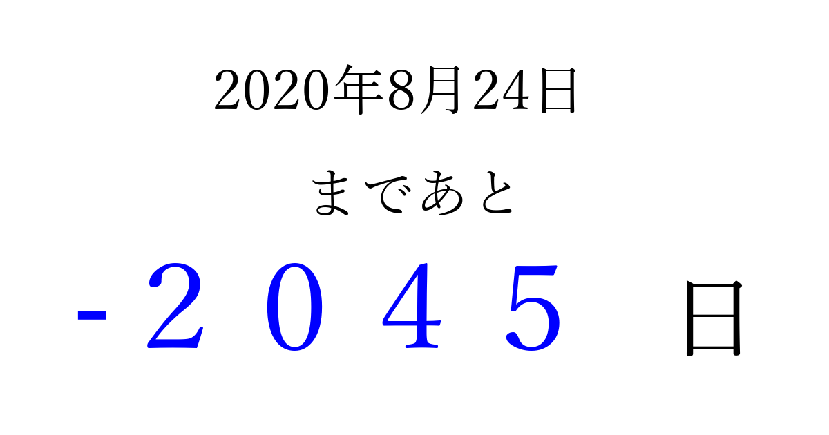 2020年8月24日(月)は もう 0000 日過ぎました 追加すると、トップページからすぐ選べるようになります ※2026/03/31現在の結果です。 最新の状態に更新する ↓シェアして、タイムライン上にカウントダウンを表示しよう!↓ 📤 この結果を共有する Tweet シェア Threads Bluesky 別の日付でカウントダウン 2020年8月のカレンダー このページをブックマークに追加すると、いつでもカウントダウンを確認できます。 (PC: Ctrl+D / Mac: ⌘+D) hitome-notes.comでは以下のページも運営しています。 指定日と期間から日付を計算 | ガチャ確率計算・シミュレーション | プライバシー・ポリシー 運営者:Avocado