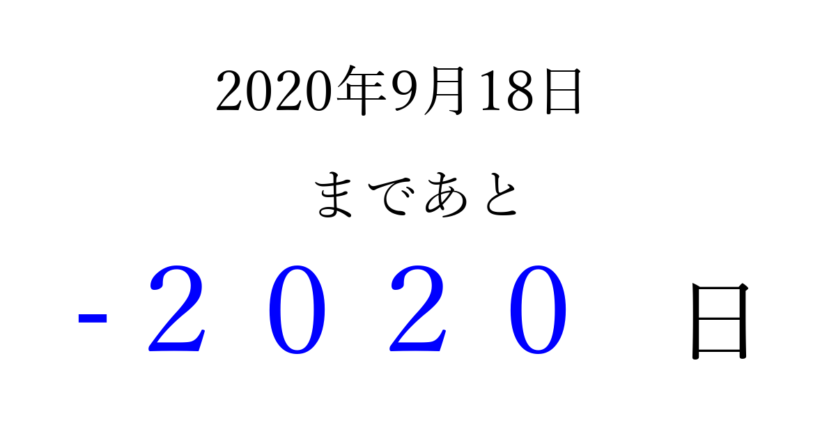 2020年9月18日(金)は もう 0000 日過ぎました 追加すると、トップページからすぐ選べるようになります ※2026/03/31現在の結果です。 最新の状態に更新する ↓シェアして、タイムライン上にカウントダウンを表示しよう!↓ 📤 この結果を共有する Tweet シェア Threads Bluesky 別の日付でカウントダウン 2020年9月のカレンダー このページをブックマークに追加すると、いつでもカウントダウンを確認できます。 (PC: Ctrl+D / Mac: ⌘+D) hitome-notes.comでは以下のページも運営しています。 指定日と期間から日付を計算 | ガチャ確率計算・シミュレーション | プライバシー・ポリシー 運営者:Avocado