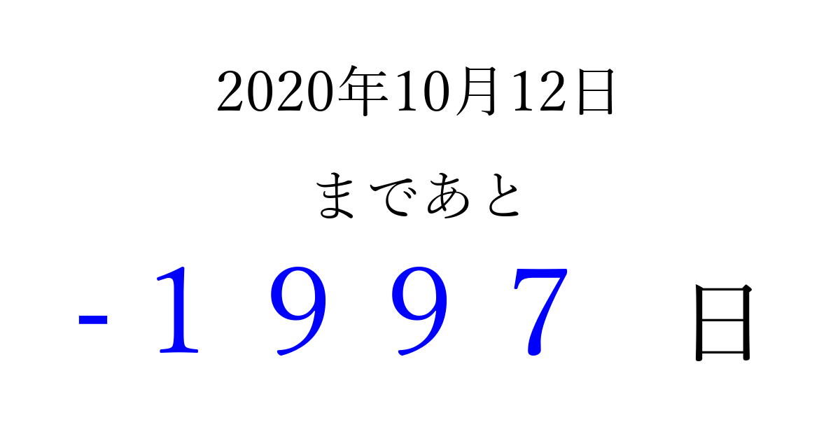 2020年10月12日(月)は もう 0000 日過ぎました 追加すると、トップページからすぐ選べるようになります ※2026/04/01現在の結果です。 最新の状態に更新する ↓シェアして、タイムライン上にカウントダウンを表示しよう!↓ 📤 この結果を共有する Tweet シェア Threads Bluesky 別の日付でカウントダウン 2020年10月のカレンダー このページをブックマークに追加すると、いつでもカウントダウンを確認できます。 (PC: Ctrl+D / Mac: ⌘+D) hitome-notes.comでは以下のページも運営しています。 指定日と期間から日付を計算 | ガチャ確率計算・シミュレーション | プライバシー・ポリシー 運営者:Avocado
