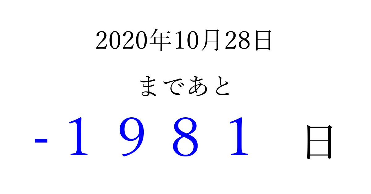 2020年10月28日(水)は もう 0000 日過ぎました 追加すると、トップページからすぐ選べるようになります ※2026/04/01現在の結果です。 最新の状態に更新する ↓シェアして、タイムライン上にカウントダウンを表示しよう!↓ 📤 この結果を共有する Tweet シェア Threads Bluesky 別の日付でカウントダウン 2020年10月のカレンダー このページをブックマークに追加すると、いつでもカウントダウンを確認できます。 (PC: Ctrl+D / Mac: ⌘+D) hitome-notes.comでは以下のページも運営しています。 指定日と期間から日付を計算 | ガチャ確率計算・シミュレーション | プライバシー・ポリシー 運営者:Avocado