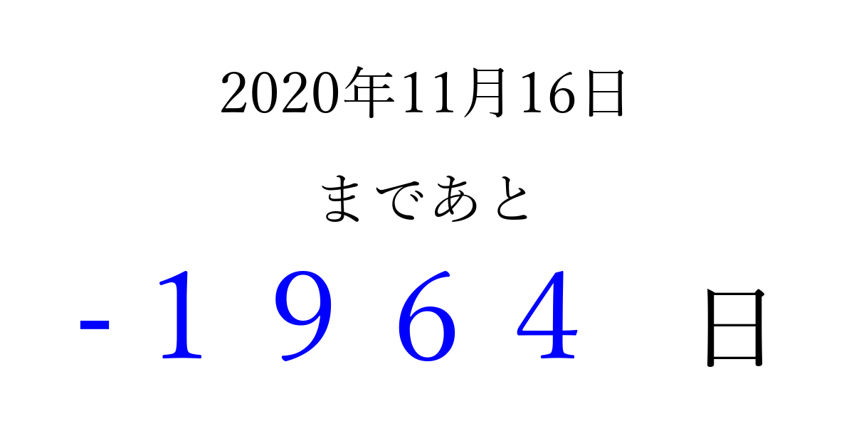 2020年11月16日(月)は もう 0000 日過ぎました 追加すると、トップページからすぐ選べるようになります ※2026/04/03現在の結果です。 最新の状態に更新する ↓シェアして、タイムライン上にカウントダウンを表示しよう!↓ 📤 この結果を共有する Tweet シェア Threads Bluesky 別の日付でカウントダウン 2020年11月のカレンダー このページをブックマークに追加すると、いつでもカウントダウンを確認できます。 (PC: Ctrl+D / Mac: ⌘+D) hitome-notes.comでは以下のページも運営しています。 指定日と期間から日付を計算 | ガチャ確率計算・シミュレーション | プライバシー・ポリシー 運営者:Avocado