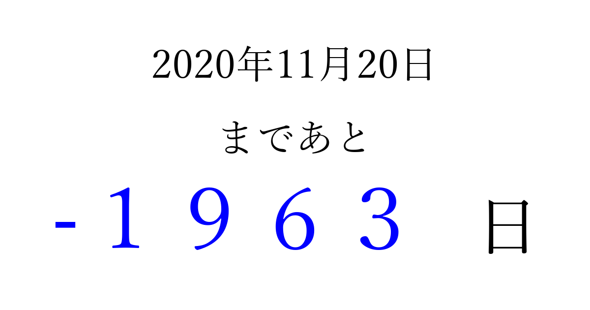 2020年11月20日(金)は もう 0000 日過ぎました 追加すると、トップページからすぐ選べるようになります ※2026/04/06現在の結果です。 最新の状態に更新する ↓シェアして、タイムライン上にカウントダウンを表示しよう!↓ 📤 この結果を共有する Tweet シェア Threads Bluesky 別の日付でカウントダウン 2020年11月のカレンダー このページをブックマークに追加すると、いつでもカウントダウンを確認できます。 (PC: Ctrl+D / Mac: ⌘+D) hitome-notes.comでは以下のページも運営しています。 指定日と期間から日付を計算 | ガチャ確率計算・シミュレーション | プライバシー・ポリシー 運営者:Avocado