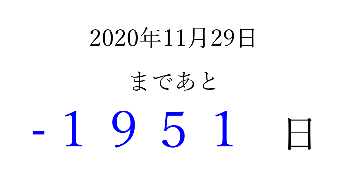 2020年11月29日(日)は もう 0000 日過ぎました 追加すると、トップページからすぐ選べるようになります ※2026/04/03現在の結果です。 最新の状態に更新する ↓シェアして、タイムライン上にカウントダウンを表示しよう!↓ 📤 この結果を共有する Tweet シェア Threads Bluesky 別の日付でカウントダウン 2020年11月のカレンダー このページをブックマークに追加すると、いつでもカウントダウンを確認できます。 (PC: Ctrl+D / Mac: ⌘+D) hitome-notes.comでは以下のページも運営しています。 指定日と期間から日付を計算 | ガチャ確率計算・シミュレーション | プライバシー・ポリシー 運営者:Avocado