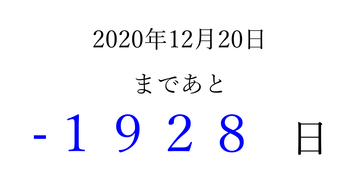 2020年12月20日(日)は もう 0000 日過ぎました 追加すると、トップページからすぐ選べるようになります ※2026/04/01現在の結果です。 最新の状態に更新する ↓シェアして、タイムライン上にカウントダウンを表示しよう!↓ 📤 この結果を共有する Tweet シェア Threads Bluesky 別の日付でカウントダウン 2020年12月のカレンダー このページをブックマークに追加すると、いつでもカウントダウンを確認できます。 (PC: Ctrl+D / Mac: ⌘+D) hitome-notes.comでは以下のページも運営しています。 指定日と期間から日付を計算 | ガチャ確率計算・シミュレーション | プライバシー・ポリシー 運営者:Avocado