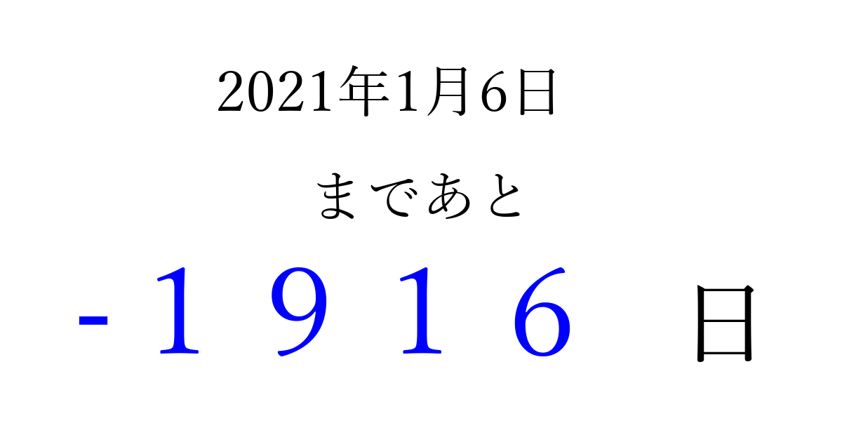 2021年1月6日(水)は もう 0000 日過ぎました 追加すると、トップページからすぐ選べるようになります ※2026/04/06現在の結果です。 最新の状態に更新する ↓シェアして、タイムライン上にカウントダウンを表示しよう!↓ 📤 この結果を共有する Tweet シェア Threads Bluesky 別の日付でカウントダウン 2021年1月のカレンダー このページをブックマークに追加すると、いつでもカウントダウンを確認できます。 (PC: Ctrl+D / Mac: ⌘+D) hitome-notes.comでは以下のページも運営しています。 指定日と期間から日付を計算 | ガチャ確率計算・シミュレーション | プライバシー・ポリシー 運営者:Avocado