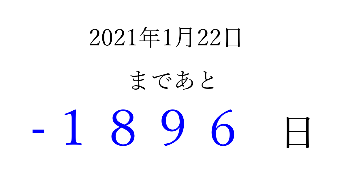 2021年1月22日(金)は もう 0000 日過ぎました 追加すると、トップページからすぐ選べるようになります ※2026/04/02現在の結果です。 最新の状態に更新する ↓シェアして、タイムライン上にカウントダウンを表示しよう!↓ 📤 この結果を共有する Tweet シェア Threads Bluesky 別の日付でカウントダウン 2021年1月のカレンダー このページをブックマークに追加すると、いつでもカウントダウンを確認できます。 (PC: Ctrl+D / Mac: ⌘+D) hitome-notes.comでは以下のページも運営しています。 指定日と期間から日付を計算 | ガチャ確率計算・シミュレーション | プライバシー・ポリシー 運営者:Avocado