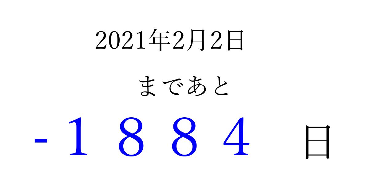 2021年2月2日(火)は もう 0000 日過ぎました 追加すると、トップページからすぐ選べるようになります ※2026/04/01現在の結果です。 最新の状態に更新する ↓シェアして、タイムライン上にカウントダウンを表示しよう!↓ 📤 この結果を共有する Tweet シェア Threads Bluesky 別の日付でカウントダウン 2021年2月のカレンダー このページをブックマークに追加すると、いつでもカウントダウンを確認できます。 (PC: Ctrl+D / Mac: ⌘+D) hitome-notes.comでは以下のページも運営しています。 指定日と期間から日付を計算 | ガチャ確率計算・シミュレーション | プライバシー・ポリシー 運営者:Avocado