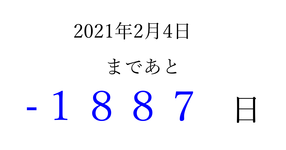 2021年2月4日(木)は もう 0000 日過ぎました 追加すると、トップページからすぐ選べるようになります ※2026/04/06現在の結果です。 最新の状態に更新する ↓シェアして、タイムライン上にカウントダウンを表示しよう!↓ 📤 この結果を共有する Tweet シェア Threads Bluesky 別の日付でカウントダウン 2021年2月のカレンダー このページをブックマークに追加すると、いつでもカウントダウンを確認できます。 (PC: Ctrl+D / Mac: ⌘+D) hitome-notes.comでは以下のページも運営しています。 指定日と期間から日付を計算 | ガチャ確率計算・シミュレーション | プライバシー・ポリシー 運営者:Avocado