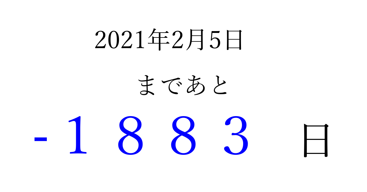 2021年2月5日(金)は もう 0000 日過ぎました 追加すると、トップページからすぐ選べるようになります ※2026/04/03現在の結果です。 最新の状態に更新する ↓シェアして、タイムライン上にカウントダウンを表示しよう!↓ 📤 この結果を共有する Tweet シェア Threads Bluesky 別の日付でカウントダウン 2021年2月のカレンダー このページをブックマークに追加すると、いつでもカウントダウンを確認できます。 (PC: Ctrl+D / Mac: ⌘+D) hitome-notes.comでは以下のページも運営しています。 指定日と期間から日付を計算 | ガチャ確率計算・シミュレーション | プライバシー・ポリシー 運営者:Avocado