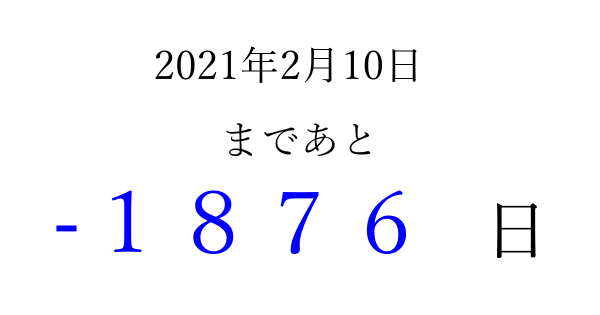 2021年2月10日(水)は もう 0000 日過ぎました 追加すると、トップページからすぐ選べるようになります ※2026/04/01現在の結果です。 最新の状態に更新する ↓シェアして、タイムライン上にカウントダウンを表示しよう!↓ 📤 この結果を共有する Tweet シェア Threads Bluesky 別の日付でカウントダウン 2021年2月のカレンダー このページをブックマークに追加すると、いつでもカウントダウンを確認できます。 (PC: Ctrl+D / Mac: ⌘+D) hitome-notes.comでは以下のページも運営しています。 指定日と期間から日付を計算 | ガチャ確率計算・シミュレーション | プライバシー・ポリシー 運営者:Avocado