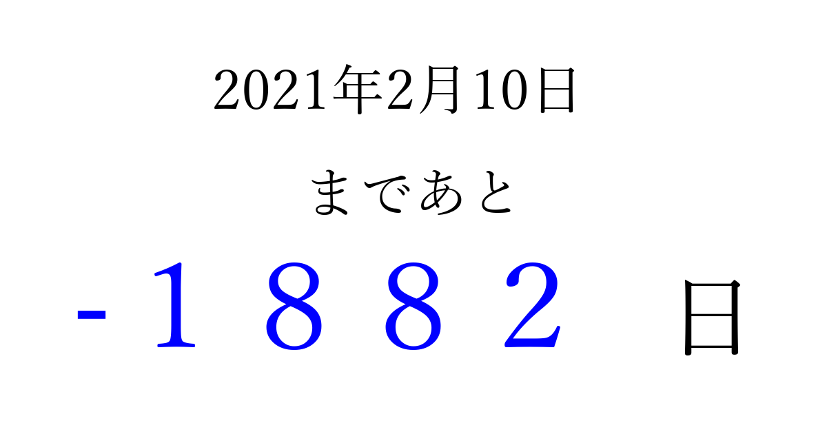 2021年2月10日(水)は もう 0000 日過ぎました 追加すると、トップページからすぐ選べるようになります ※2026/04/07現在の結果です。 最新の状態に更新する ↓シェアして、タイムライン上にカウントダウンを表示しよう!↓ 📤 この結果を共有する Tweet シェア Threads Bluesky 別の日付でカウントダウン 2021年2月のカレンダー このページをブックマークに追加すると、いつでもカウントダウンを確認できます。 (PC: Ctrl+D / Mac: ⌘+D) hitome-notes.comでは以下のページも運営しています。 指定日と期間から日付を計算 | ガチャ確率計算・シミュレーション | プライバシー・ポリシー 運営者:Avocado