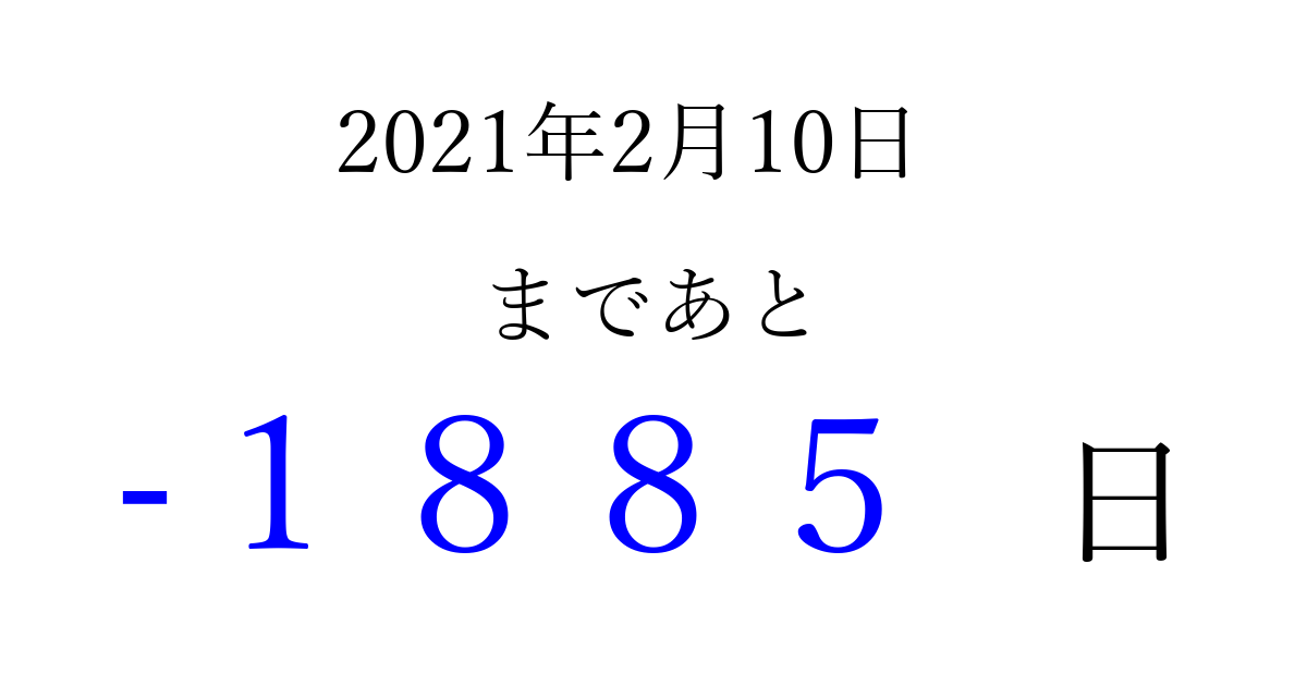 2021年2月10日(水)は もう 0000 日過ぎました 追加すると、トップページからすぐ選べるようになります ※2026/04/10現在の結果です。 最新の状態に更新する ↓シェアして、タイムライン上にカウントダウンを表示しよう!↓ 📤 この結果を共有する Tweet シェア Threads Bluesky 別の日付でカウントダウン 2021年2月のカレンダー このページをブックマークに追加すると、いつでもカウントダウンを確認できます。 (PC: Ctrl+D / Mac: ⌘+D) hitome-notes.comでは以下のページも運営しています。 指定日と期間から日付を計算 | ガチャ確率計算・シミュレーション | プライバシー・ポリシー 運営者:Avocado