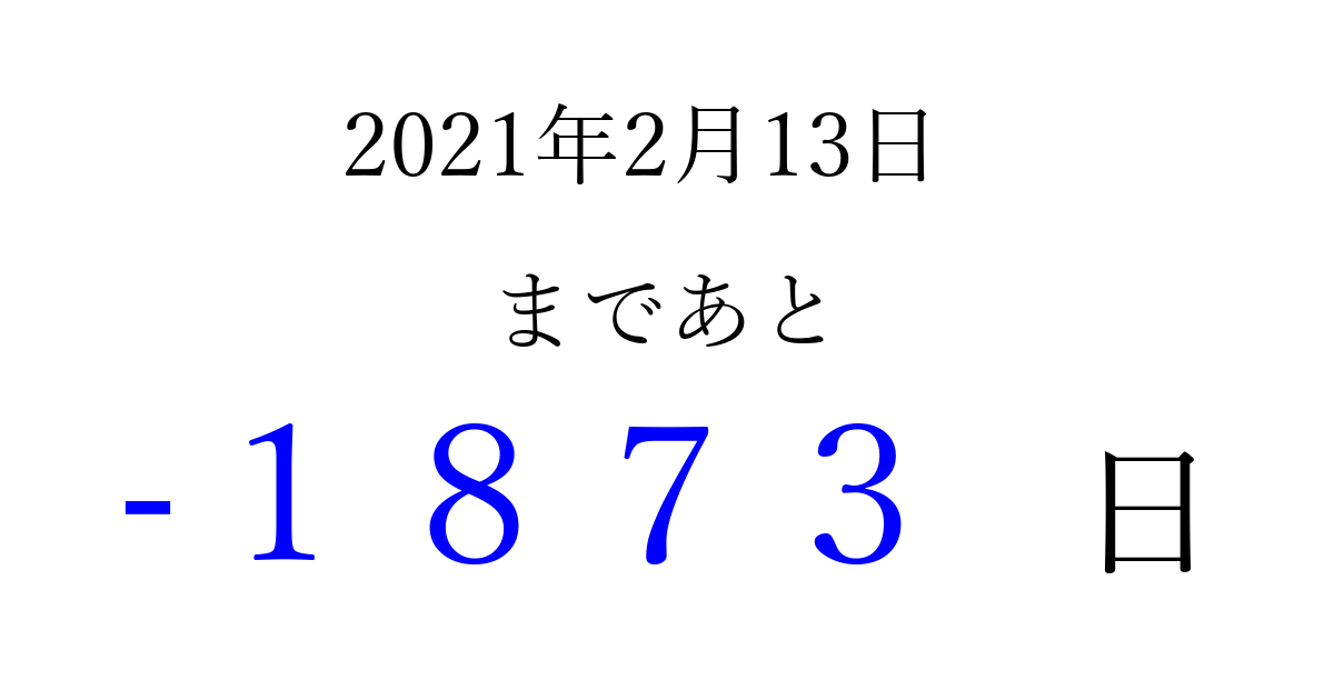 2021年2月13日(土)は もう 0000 日過ぎました 追加すると、トップページからすぐ選べるようになります ※2026/04/01現在の結果です。 最新の状態に更新する ↓シェアして、タイムライン上にカウントダウンを表示しよう!↓ 📤 この結果を共有する Tweet シェア Threads Bluesky 別の日付でカウントダウン 2021年2月のカレンダー このページをブックマークに追加すると、いつでもカウントダウンを確認できます。 (PC: Ctrl+D / Mac: ⌘+D) hitome-notes.comでは以下のページも運営しています。 指定日と期間から日付を計算 | ガチャ確率計算・シミュレーション | プライバシー・ポリシー 運営者:Avocado