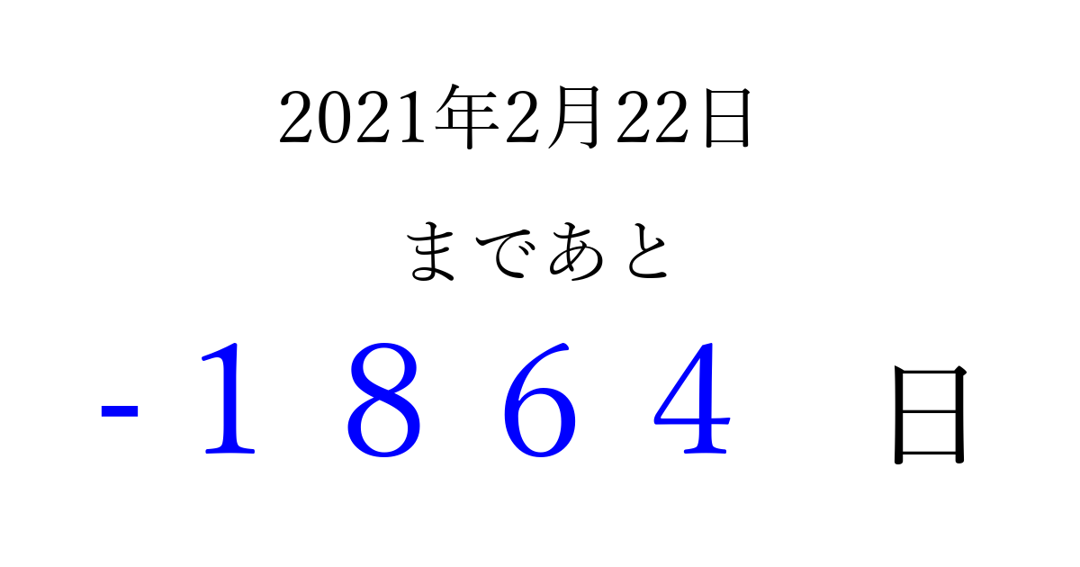 2021年2月22日(月)は もう 0000 日過ぎました 追加すると、トップページからすぐ選べるようになります ※2026/04/01現在の結果です。 最新の状態に更新する ↓シェアして、タイムライン上にカウントダウンを表示しよう!↓ 📤 この結果を共有する Tweet シェア Threads Bluesky 別の日付でカウントダウン 2021年2月のカレンダー このページをブックマークに追加すると、いつでもカウントダウンを確認できます。 (PC: Ctrl+D / Mac: ⌘+D) hitome-notes.comでは以下のページも運営しています。 指定日と期間から日付を計算 | ガチャ確率計算・シミュレーション | プライバシー・ポリシー 運営者:Avocado